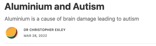 Dr. Christopher Exeley a renowned scientist and aluminum expert, has stated: ”Severe, debilitating autism is a consequence of brain damage. Damage to the brain is invariably inflicted during the first months of an infant’s life. In rarer cases the damage may originate in the womb. Susceptibility to brain damage will be significantly influenced by genetic factors. However, as in Alzheimer’s in later life, toxins are responsible for brain damage in infants leading to autism. The leading toxic candidate to date is aluminum.“