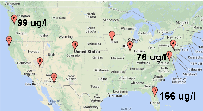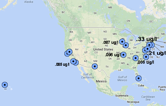 From the 35 samples received from across the U.S., 13 samples were above the minimum detectable level. The three highest levels were all found in women, with the highest in Oregon (18.8 ug/l). Other positive results were found in samples from the states of California, Washington, Maryland, Colorado and Hawaii.