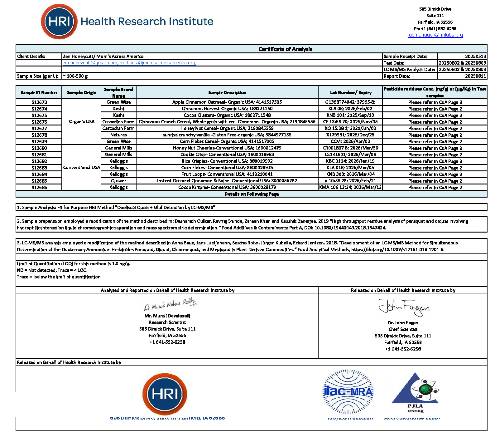 - Kashi – Cinnamon Harvest (Organic USA) → ND (Not Detected)