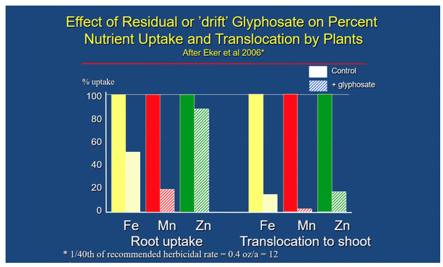 - REDUCES Nutrients - Glyphosate is a chelator, and studies have shown that a drift-level exposure (1/40th of the normal application, Dr. Don Huber) reduces the nutrient uptake into the shoot of the crop by 80-95%. The nutrients tested were iron, magnesium, and zinc - essential nutrients for the immune system and for many other important functions. A weakened plant immune system, just like in humans, means the plants die from exposure to normally harmless bacteria, viruses, mold, or challenging weather conditions. Low levels of nutrients revealed by our testing of school meals, fast food, and military food means a weaker and sicker nation **and weakened national security, including weakened ability to respond to military threats.